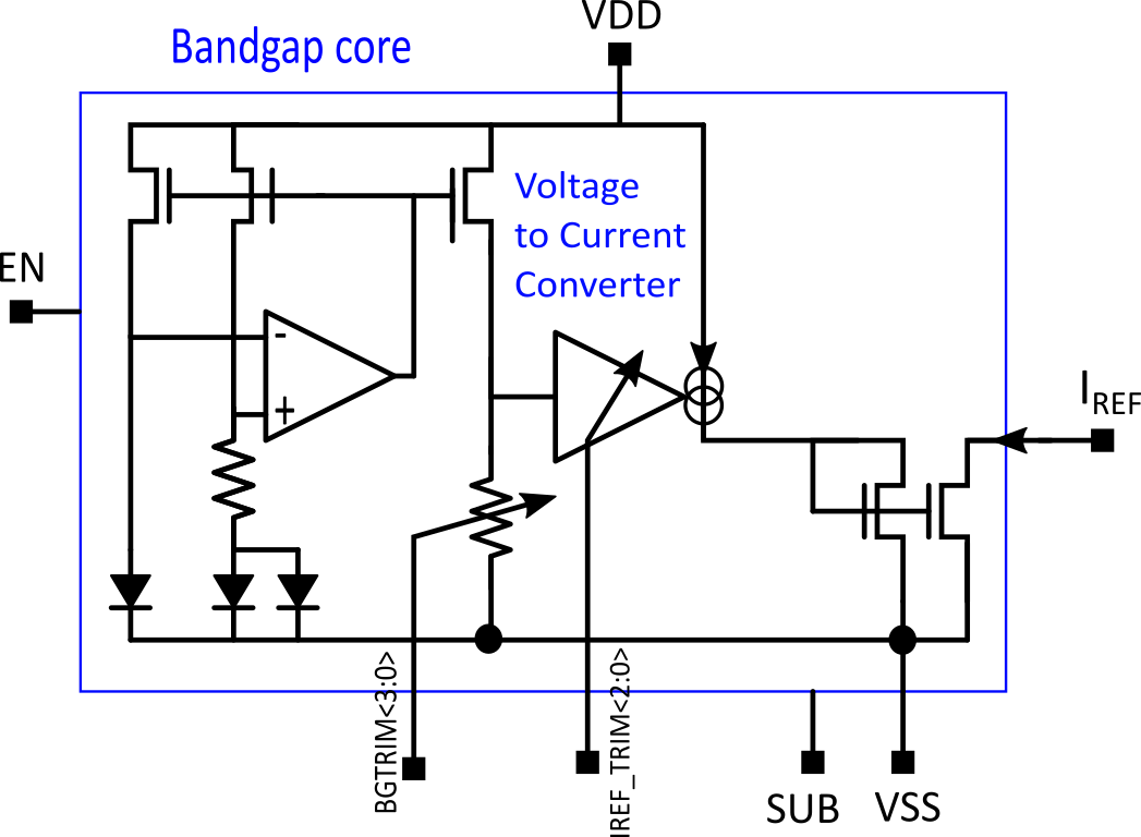 - Bandgap reference voltage providing 600mV +/-3%, 4-bit trim, non-buffered, 5.5V