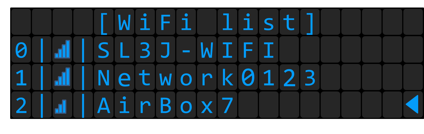 The WLAN SCAN will provide an indexed list of WLAN networks, filtered by signal power. Press OK to launch a WIFI scan and wait a few seconds. Then, browse the wifi list with UP and DOWN keys and select the desired network with OK. Then a virtual keyboard will be displayed for you to type the password. The usage of the virtual keyboard is explained in a dedicated section (see Virtual Keyboard).