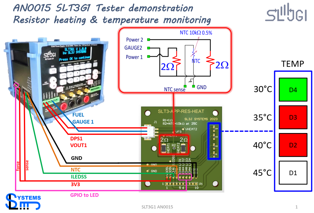A simple PCB with 2 heating resistors and embeded NTC temperature sensors to be driven by SLT3G1 to demostrate simple tester capabilities