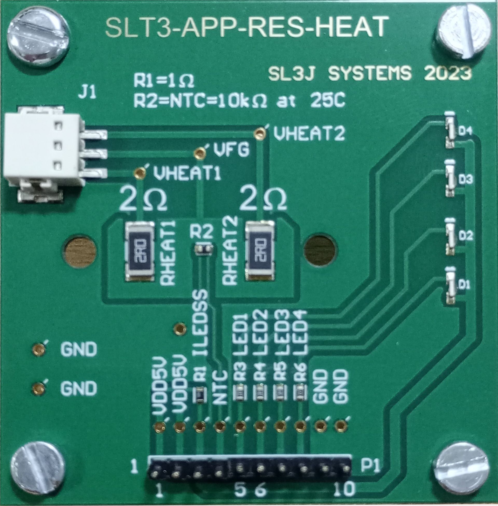 SLT3-APP-RES-HEAT is a simple hardwar embedding 2 power resistors (2Ω 1W 2512) connected to power ground connection with a temperature sensing varistor (a 10kΩ NTC) placed in the middle. It also embeds 3 red LEDs and 1 green LED for general purpose flag display.
